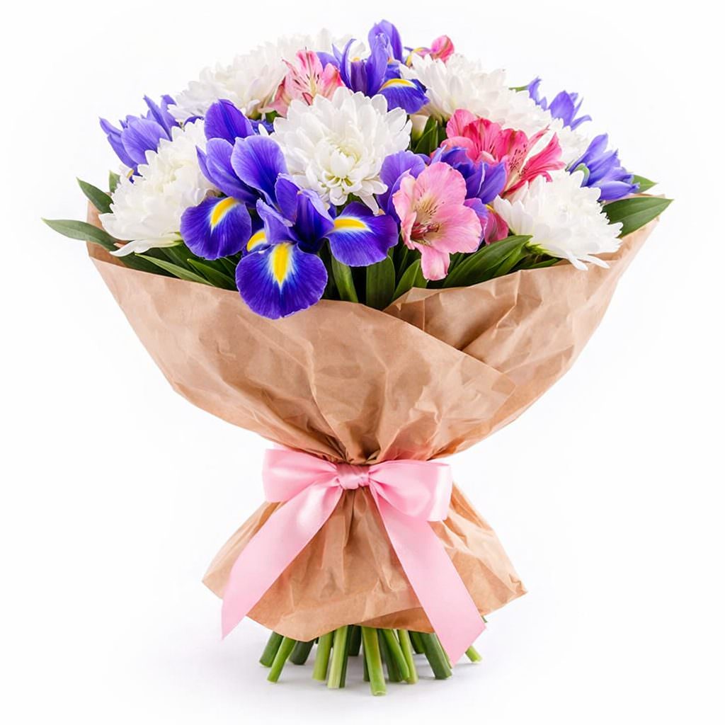 Яркие и нежные оттенки белоснежных хризантем, фиолетовых ирисов и розовых альстромерий создают атмосферу радости и свежести. Букет оформлен в крафт-бумагу с розовой атласной лентой. Композиция наполняет пространство лёгкостью и элегантностью. Прекрасный подарок для поздравления с днём рождения или выражения благодарности близкому человеку.