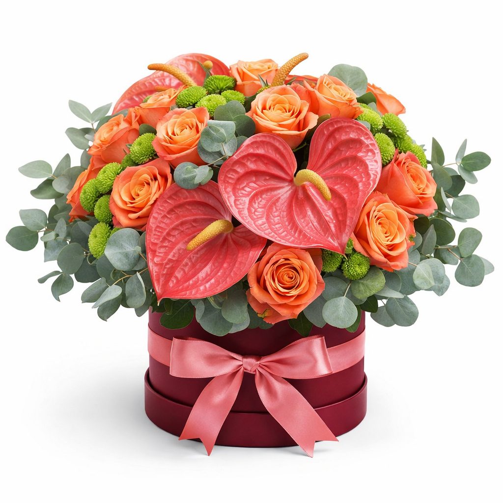 Яркие коралловые и зеленые оттенки создают атмосферу радости и свежести. В составе антуриум, коралловая роза, зеленая кустовая хризантема и эвкалипт. Композиция оформлена в элегантной шляпной коробке бордового цвета, украшенной кружевной лентой. Этот букет создаст праздничное настроение на золотую свадьбу и станет отличным подарком для родителей.