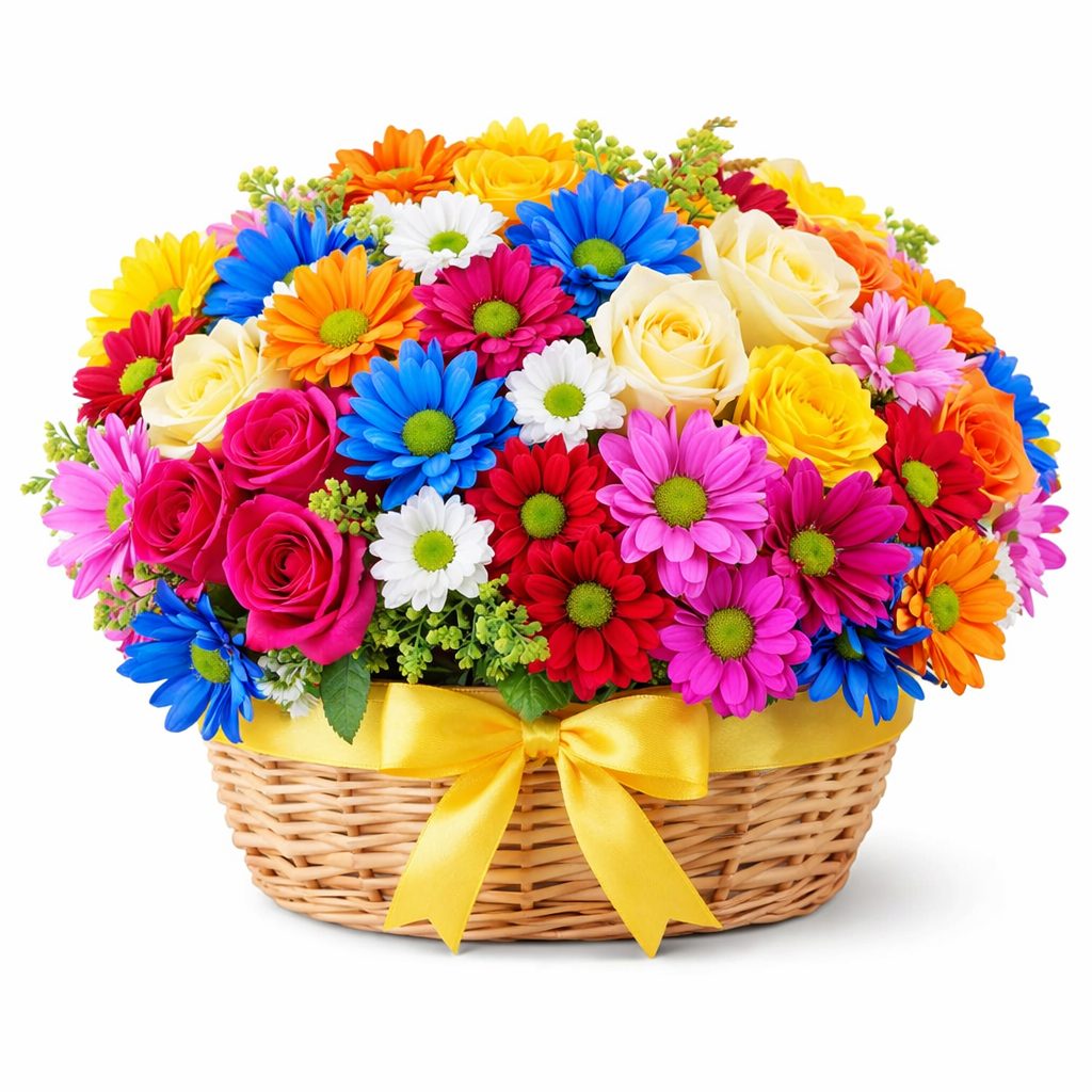 Эта яркая композиция из разноцветных хризантем, одноголовых роз и солидаго создает атмосферу радости и праздника. Плетёная корзина добавляет естественного шарма и делает подарок завершённым. Идеально подойдет для вручения диплома и порадовать молодую маму. Прекрасный выбор для создания праздничного настроения.