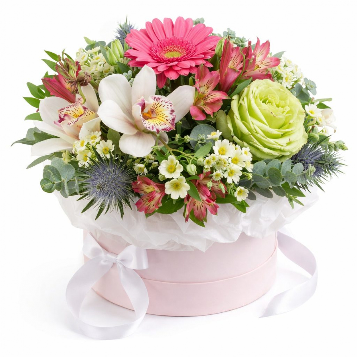 Яркие розовые и белые оттенки создают нежную атмосферу. В составе белая орхидея, розовая гербера, декоративная капуста, мини-белая кустовая хризантема, розовая альстромерия, эрингиум и эвкалипт. Композиция оформлена в элегантной шляпной коробке с белой лентой. Идеально для создания романтического настроения на годовщину для любимой.